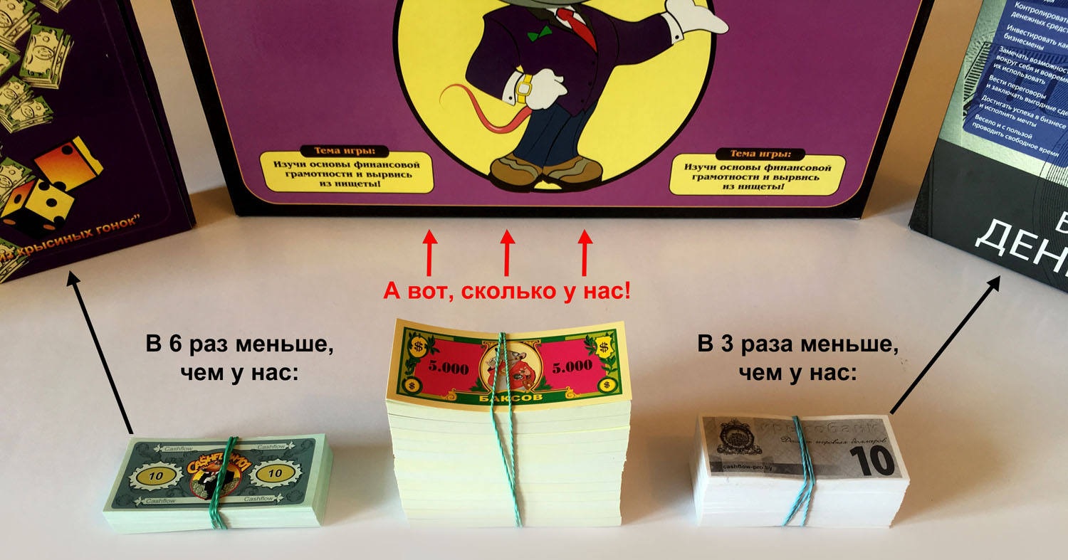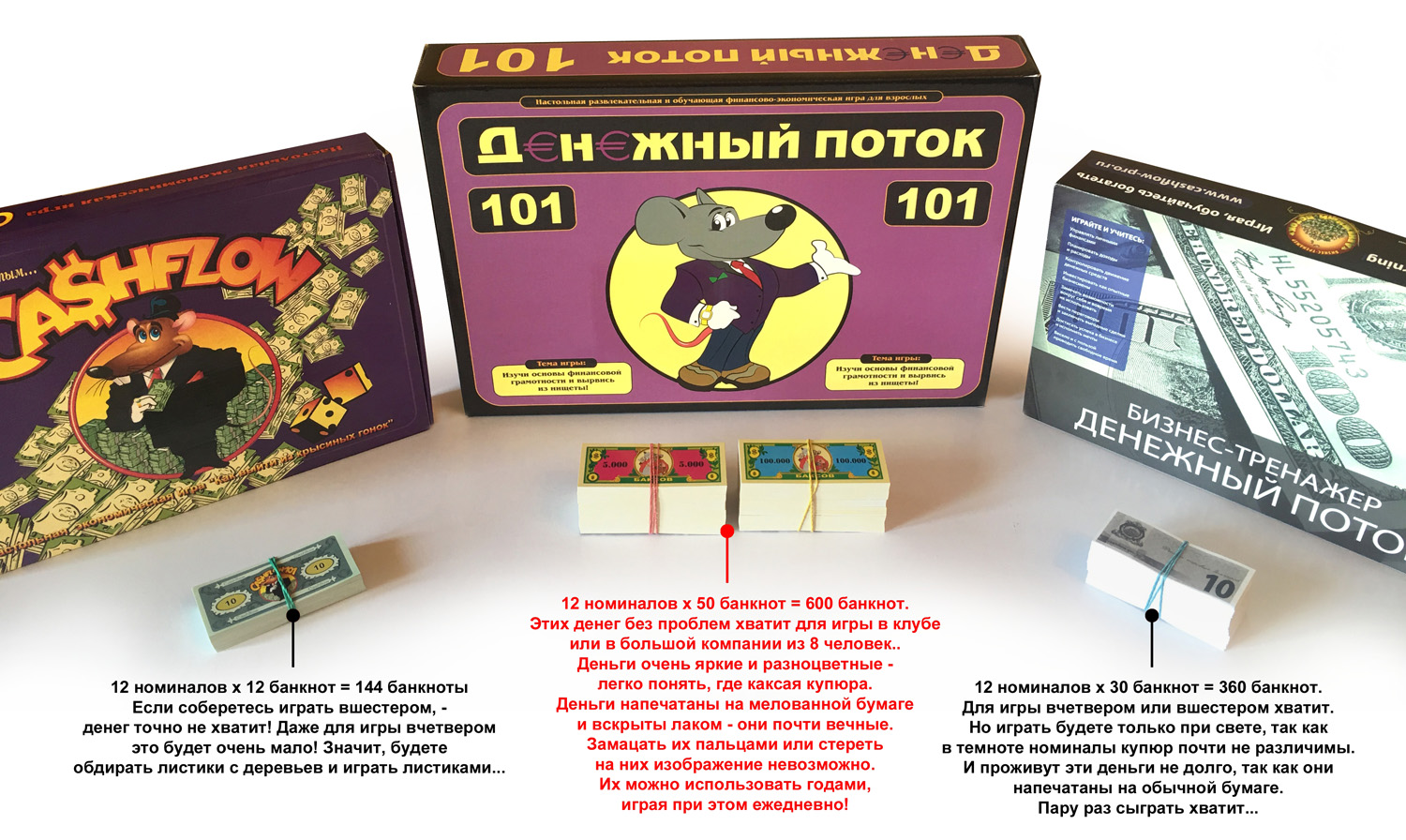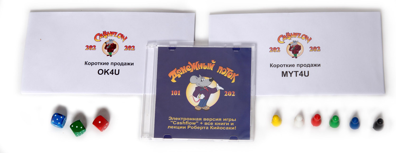 Единственный недостаток нашей игры в сравнении с оригиналом, - у нас в игре используются обычные фишки, а не фигурки крысок и сырочков, потому что их производство требует совершенно другого типа оборудования, которое не имеет отношения к производству полиграфической продукции... За то в каждой коробке нашего "Денежного потока" вы найдете диск с электронной версией игры "Cashflow" и всеми книгами и видео-лекциями Роберта Кийосаки. С нашей точки зрения - это для вас куда полезнее и важнее, чем пластмассовые крыски! Не так ли?