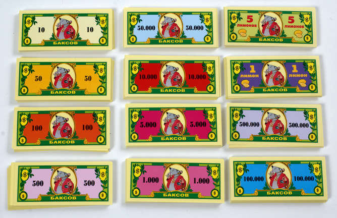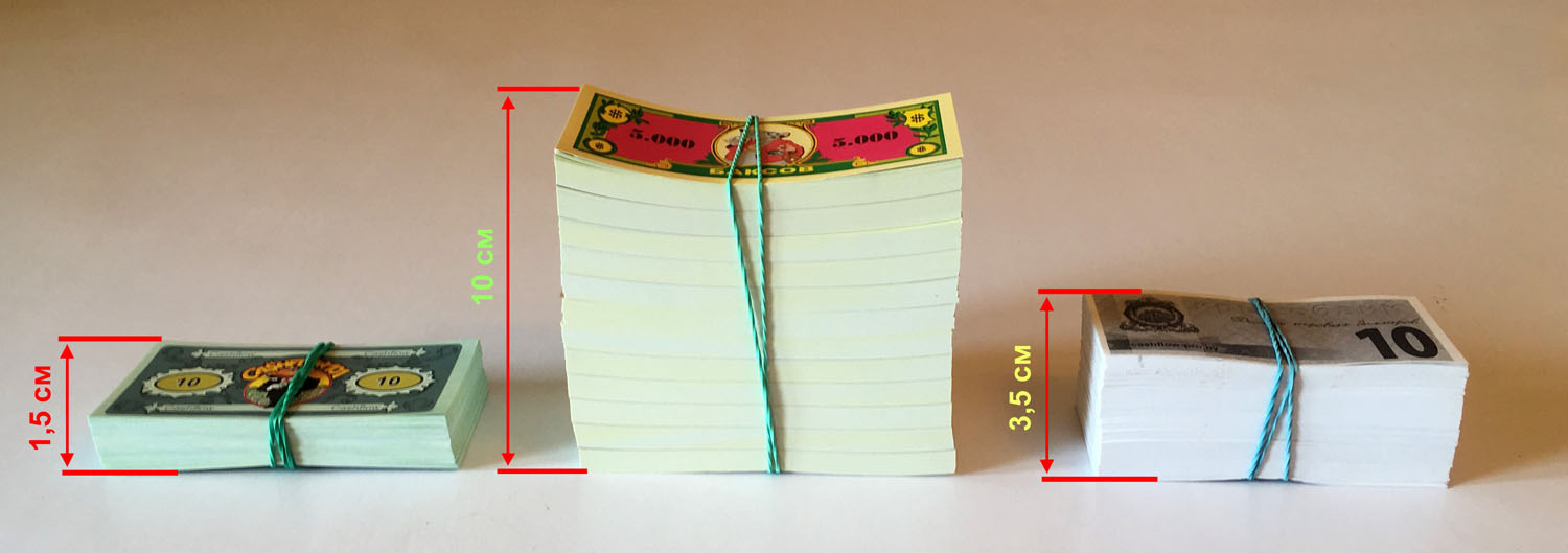 И мы не экономим на размере и количестве банкнот, убирая «лишние» и «не нужные» купюры. В нашей коробке вы найдете 12 номиналов банкнот по 50 купюр каждого номинала, что позволяет без проблем играть в нашу игру, даже если вы соберете 12 человек за одним игровым столом! Игровых денег хватит на всех! У других производителей очень часто вместо 12 видов купюр печатаются только 6 или 8, а вместо 50 банкнот в набор кладут только 20-25. В результате получается, что в нашей коробке лежит 600 купюр, а у других производителей только 200.