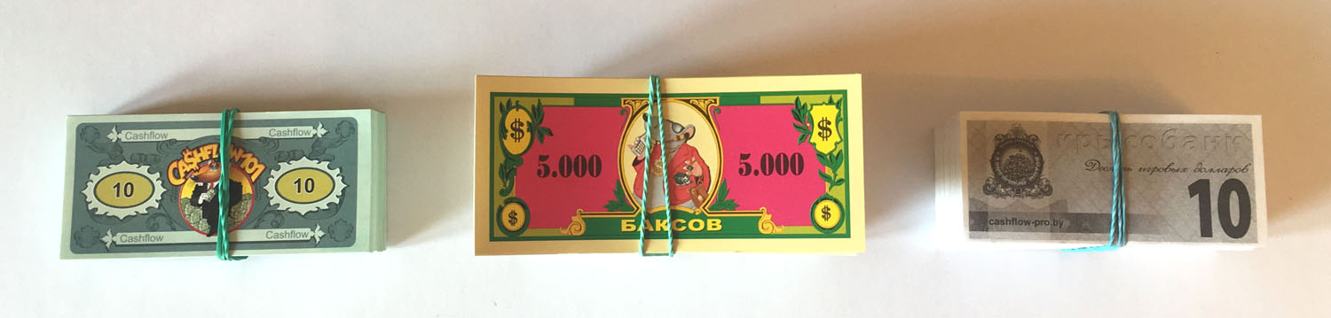 Деньги в нашей игре напечатаны в полноцветном режиме на дорогой глянцевой бумаге и вскрыты лаком, что делает их практически вечными. Они яркие, сочные и блестящие. Эти деньги практически не мнутся, никогда не пачкаются грязными пальцами, а изображение на них никогда не сотрется, сколько бы ими не играли.