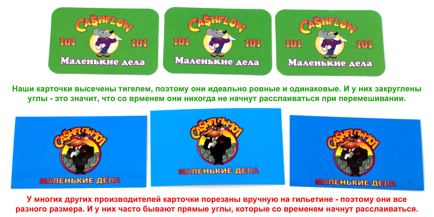 У карточек обязательно скруглены углы, чтобы они не начали со временем заламываться и расслаиваться. При этом углы скругляются тигелем – то есть машинным способом, а не вручную – тогда закругления будут идеально ровные и одинаковые! Зачем вообще закруглять углы у карточек и почему это так важно, спросите вы? Но вы ведь сталкивались когда-нибудь с тем, что вы купили игральные карты для покера, а через 5-6 игр они начали у вас расслаиваться и их уже невозможно перемешивать? Точно так же и с карточками для игры "Денежный поток" – их необходимо тщательно перемешивать перед каждой игрой. Если вы купите игру, напечатанную в ксерокс-центре на китайском картоне и без скругленных углов – после 5-6 перемешиваний вы увидите результат: карточки расслоятся, и их будет сложно перемешивать. Если вы купите нашу игру, - вы можете перемешивать эти карточки годами и использовать эту игру в клубах с утра до вечера – а она и через пять лет будет как новая.