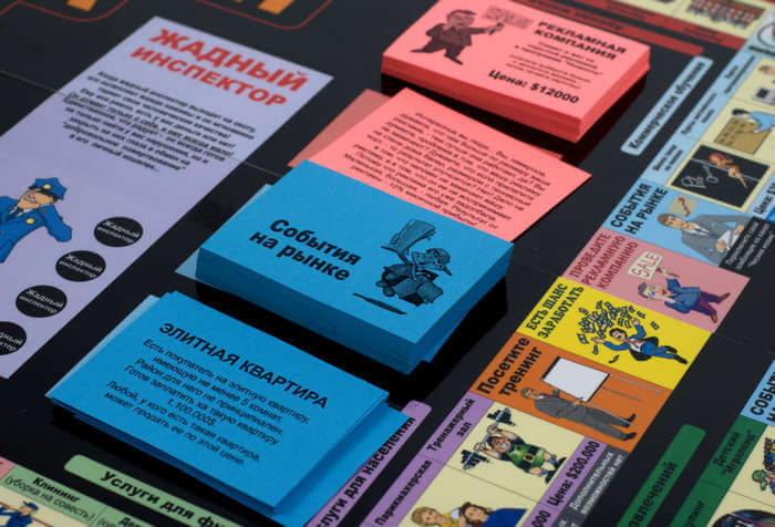 Это реализовано при помощи двух карточек «Начался глобальный экономический кризис» и «Глобальный экономический кризис закончился». Эти карточки перемешиваются с другими карточками в соответствующих наборах «События на рынке до кризиса» и «Неприятности на рынке во время кризиса». Первая карточка управляет началом кризиса. Вторая – его завершением кризиса. Игра начинается в условиях процветания, когда деньги буквально сыплются с неба и можно зарабатывать на всем! Все продается, все покупается, все бизнесы приносят прибыль, играть легко и весело! Игроки входят в азарт и начинают открывать все новое и новые виды бизнесов, покупают машины, квартиры, земельные участки на перепродажу! Но есть один нюанс: все это имущество нужно успеть выгодно продать до начала кризиса. От всех предприятий, которые ориентированы лишь на процветающую экономику, нужно избавиться до начала кризиса. Потому что после выхода карточки «Начался экономический кризис» игра останавливается и переводится в кризисный режим. Все наборы карточек меняются, условия игры меняются, рентабельность бизнесов меняется, - и на игровом поле начинается ад, кошмар и выживание! И в новых наборах карточек – уже совеем другие цены! И то, что до кризиса стоило баснословно дорого, теперь продается за гроши и дешевеет с каждым ходом. В новых наборах карточек клиента, готового купить вашу землю или квартиру, еще надо поискать! И даже если он найдется – он даст за нее копейки. В новых условиях многие бизнесы, которые успешно работали до кризиса, торговали предметами роскоши или дорогими развлечениями, - станут убыточными и начнут раздевать своих владельцев. И продать их уже нельзя – они никому не нужны! Так что ставки здесь очень высоки! Можно хорошо заработать, а можно и все потерять! И при этом никто из игроков не знает, где в наборе карточек лежит карточка, извещающая о начале кризиса. Никто также не знает, сколько у него есть времени. А значит, ни один игрок не знает, успеет ли он выгодно перепродать машины, квартиры и земельные участки. Успеет ли он отбить свои бизнесы или нет.