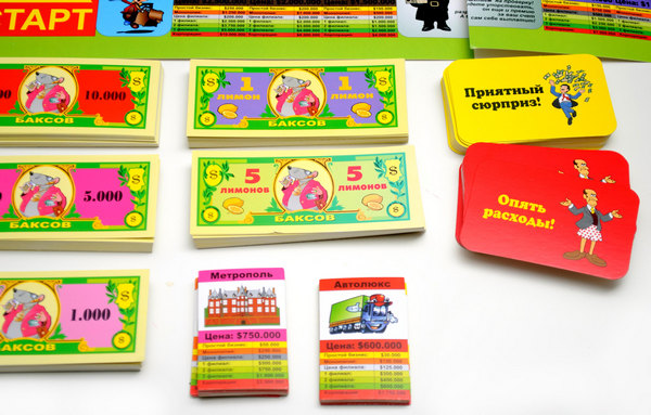 - комплект игровых денег (8 номиналов по 50 купюр)